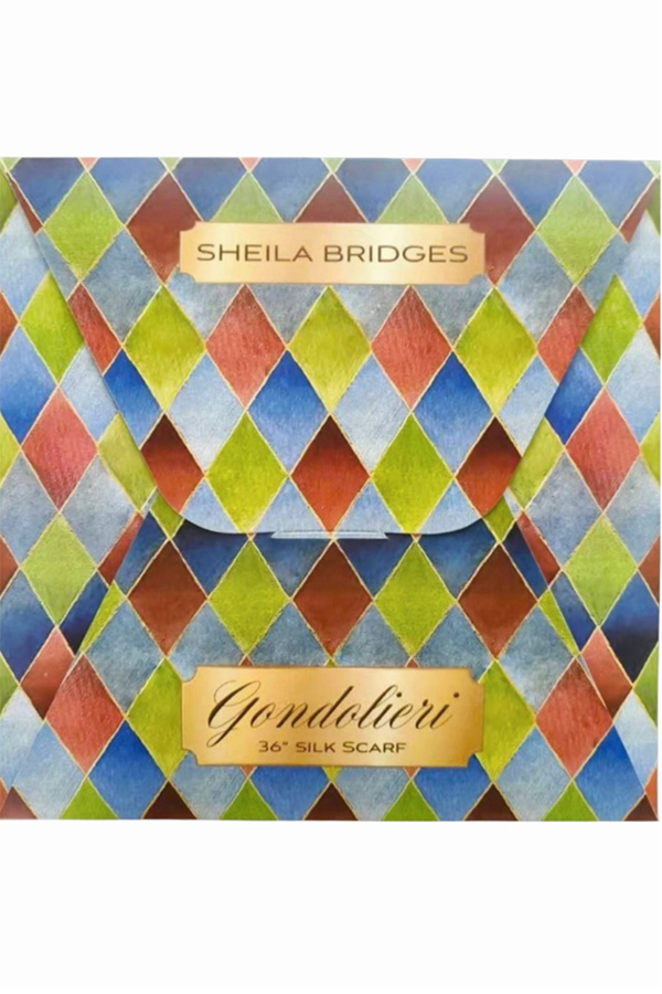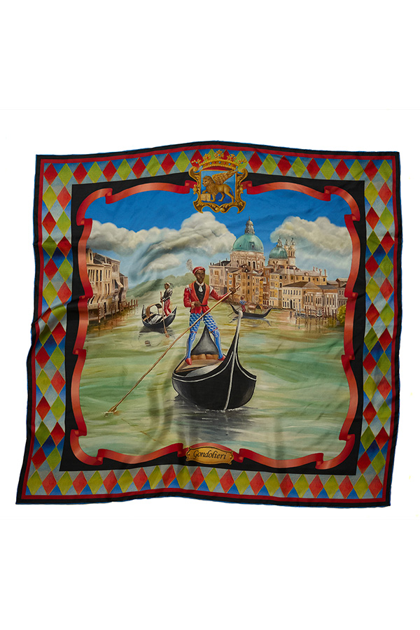 Gondolieri Silk Scarf 36″ x 36″ square. Double sided 100% silk scarf with hand-rolled edge. Designed in Rome and imported from Shanghai. Dry Clean only. All sales are final. We do not accept returns on this product.