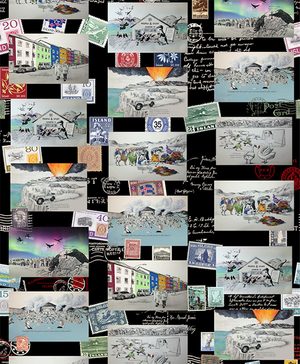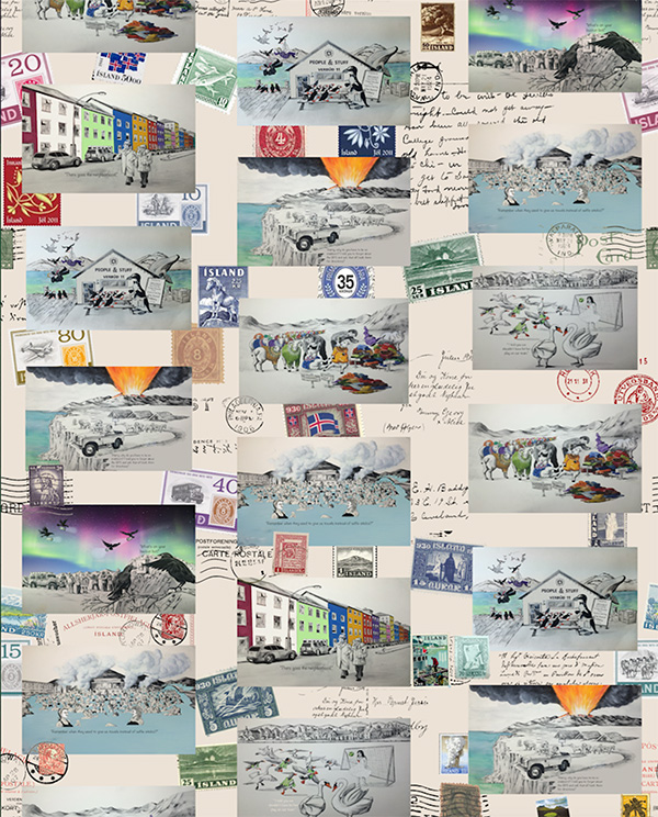 Located near the Arctic Circle, Iceland is the second largest island in Europe and is situated halfway between North America and mainland Europe. It has become one of my favorite places to visit because of its beautiful and dramatic landscape of black sand beaches, geysers, volcanos, waterfalls, and glaciers. Reykjavik, the world’s northernmost capital city is known for its nightlife, festivals, museums, food and music scene, and is picturesquely set amidst a backdrop of colorful houses. My latest wallpaper design, POSTCARDS FROM ICELAND is inspired by my travels in this interesting country.